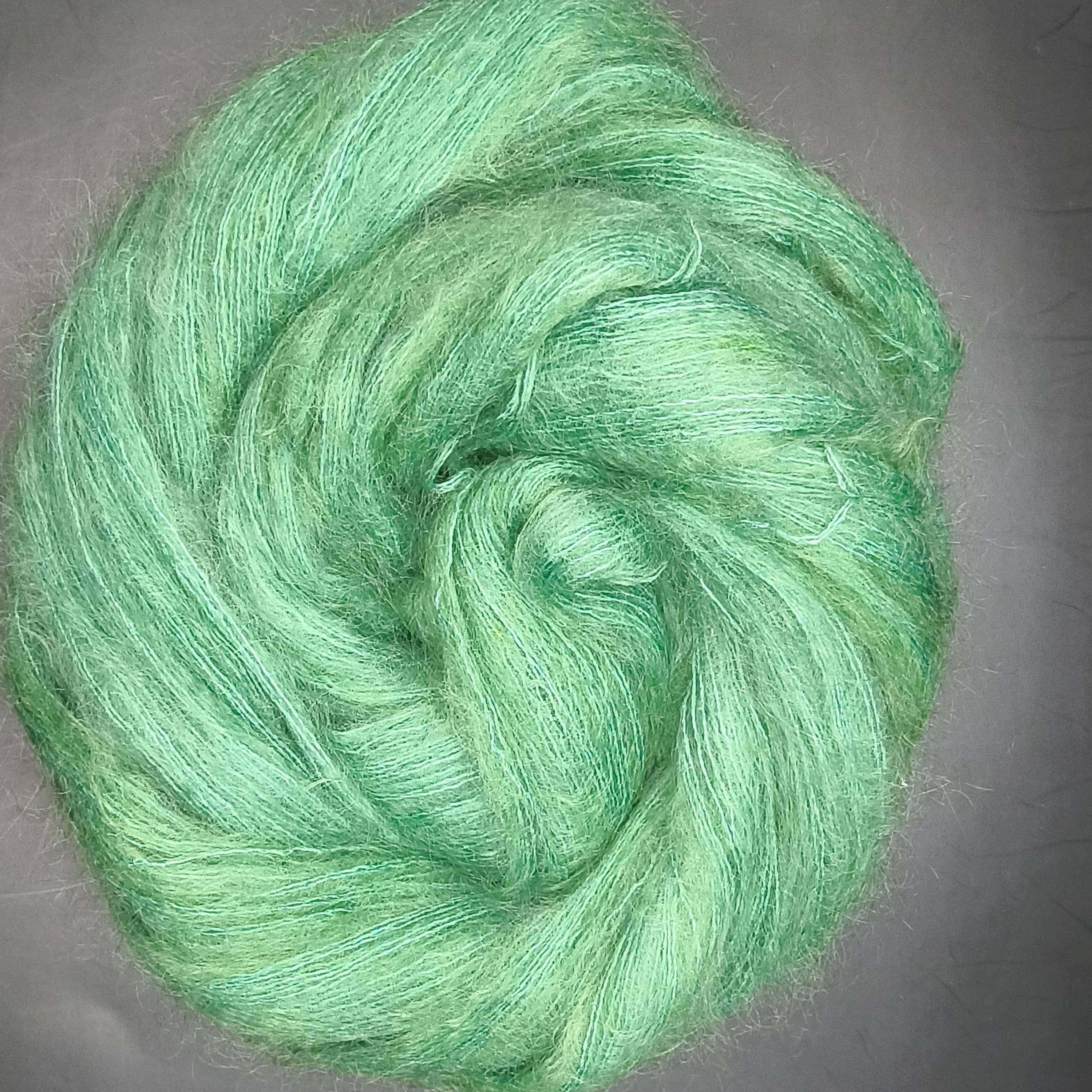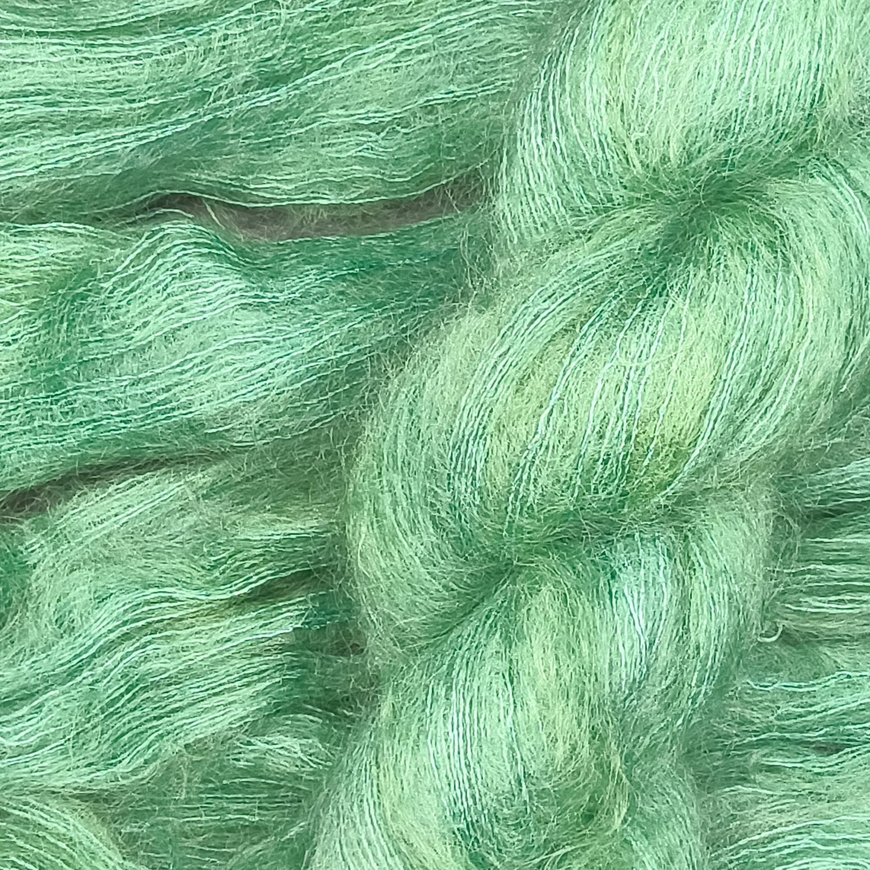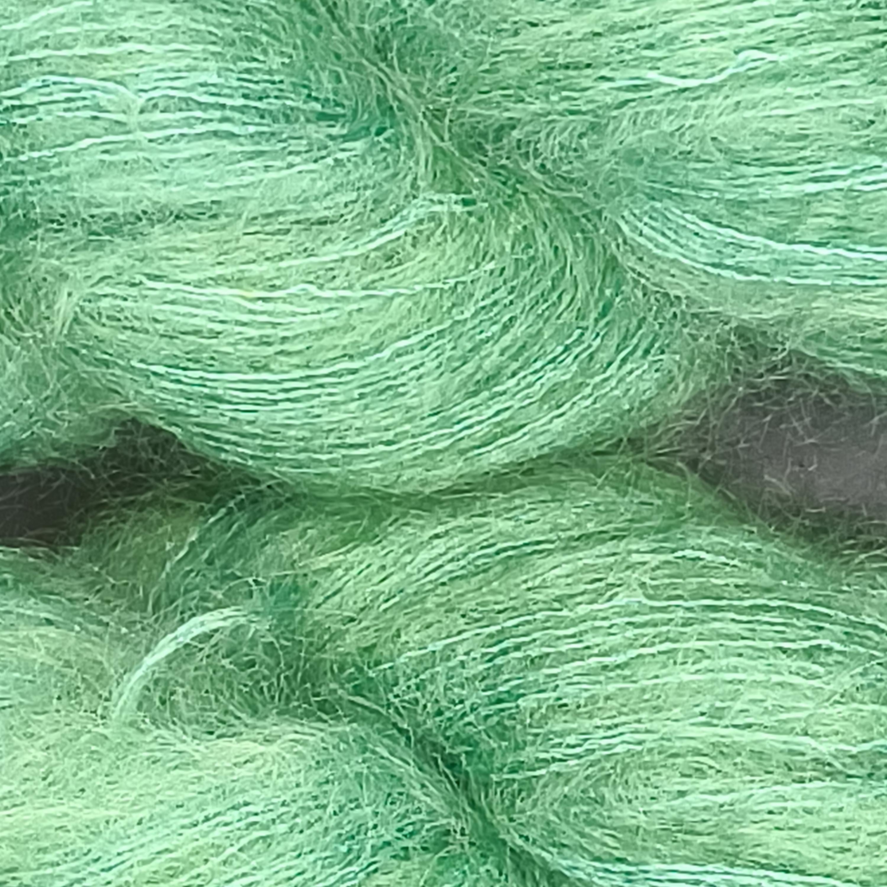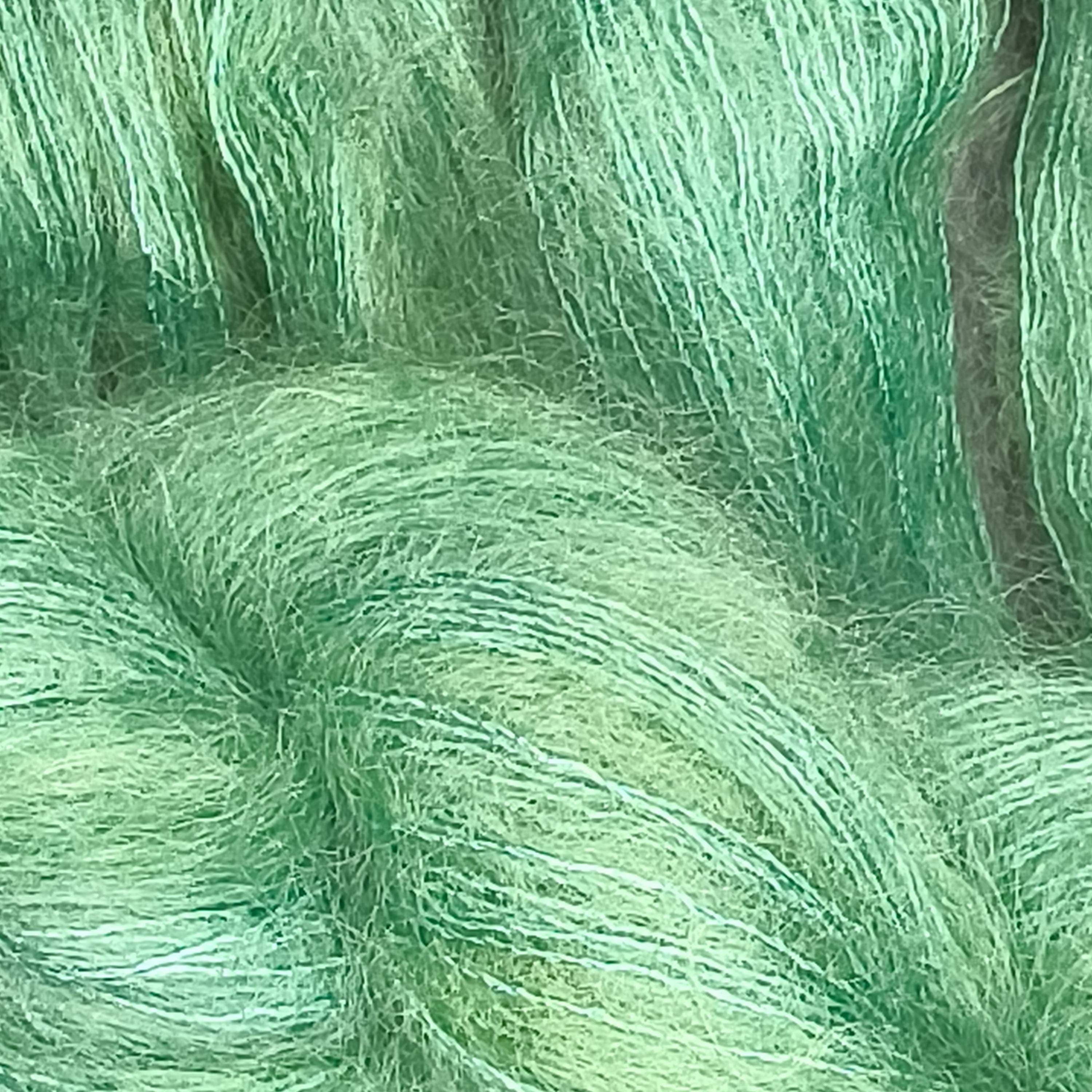 72% Kid Mohair, 28% Mulberry Silk, Single Ply, Lace Weight. 50g 459 yards.